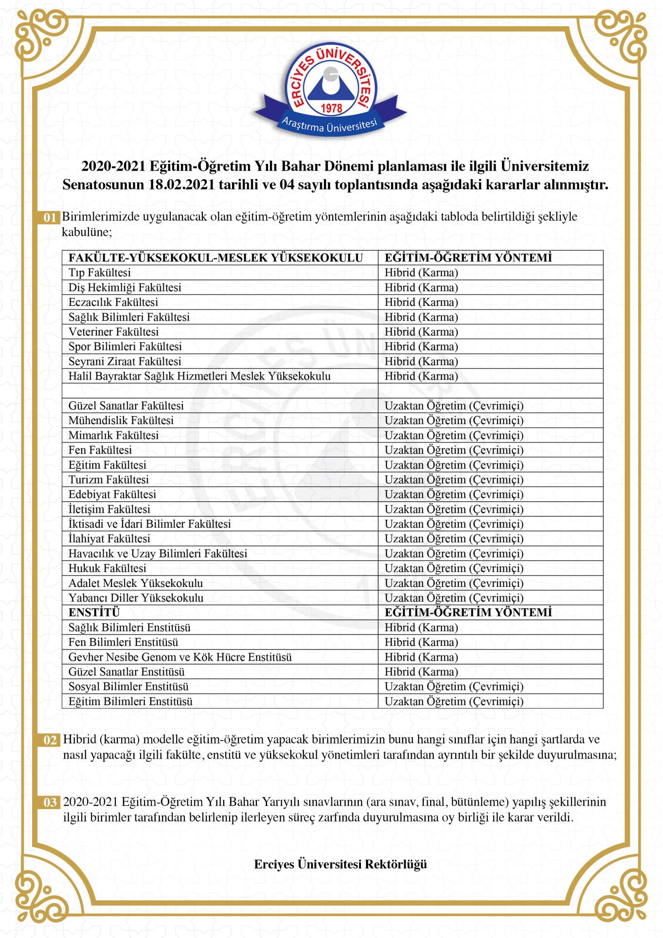 2020 2021 egitim ogretim yili bahar donemi icin universitemiz senatosu